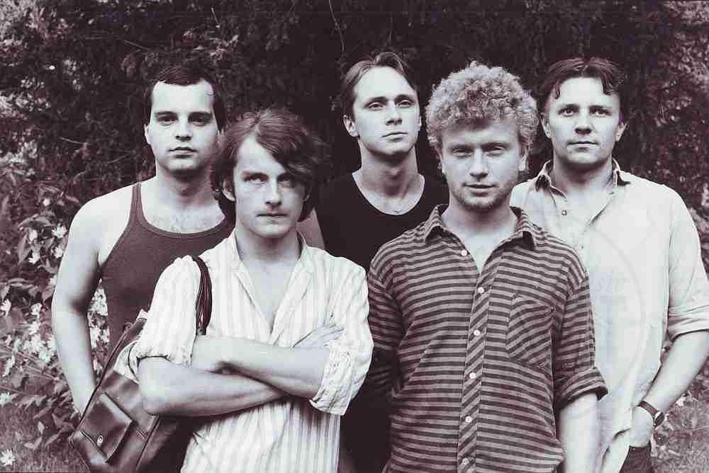 Foto: Stanislav Tůma: Psí vojáci v roce 1983/4. Kromě základu Topol, Hazuka, Skála, byli členy ještě Pavel Cigánek (housle) a Jaroslav Fensterer (kytara).