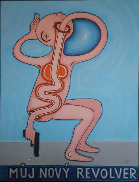 Luboš Plný: Můj nový revolver / My New Revolver, 2001, olej / plátno, 85 x 110 cm, cena k dotázání v Artinbox Gallery